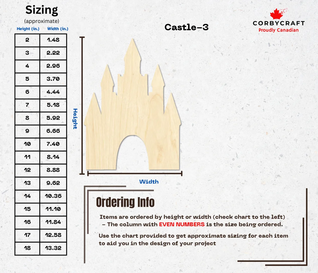 This laser-cut Baltic birch castle cutout brings medieval charm to any craft project. The unfinished wood blank is ready for your creative touchโ€”paint it, stain it, burn designs into it, or leave it natural. It works great as wall art, a door hanger, or part of a larger display. The precision laser cutting means clean edges and professional-looking results every time.