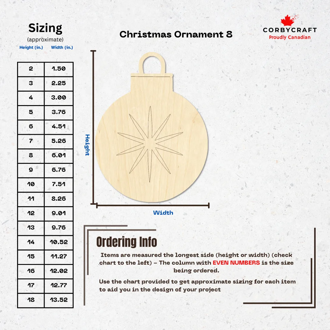 Christmas Ornament #8 is a laser-cut Baltic birch blank ready for whatever you want to create. These unfinished wood pieces are perfect for painting, wood burning, staining, or leaving natural. Hang them on your tree, gift them to friends, or use them as door hangers and wall decorations. Since they’re pre-cut and ready to go, you skip the hard part and jump straight to making them yours.