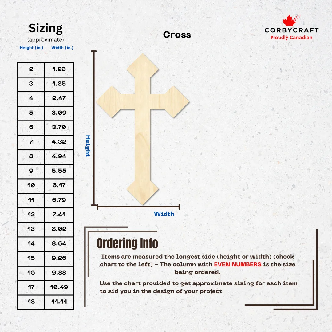 Meet Wooden Cross Cutouts #5โprecision laser-cut Baltic birch blanks ready for whatever you dream up. These unfinished wooden crosses are the perfect starting point for religious art, faith-based gifts, or meaningful home dรฉcor. Cut from quality Baltic birch plywood and available in 1/8″ or 1/4″ thickness, they’re smooth, ready to customize, and built to last.