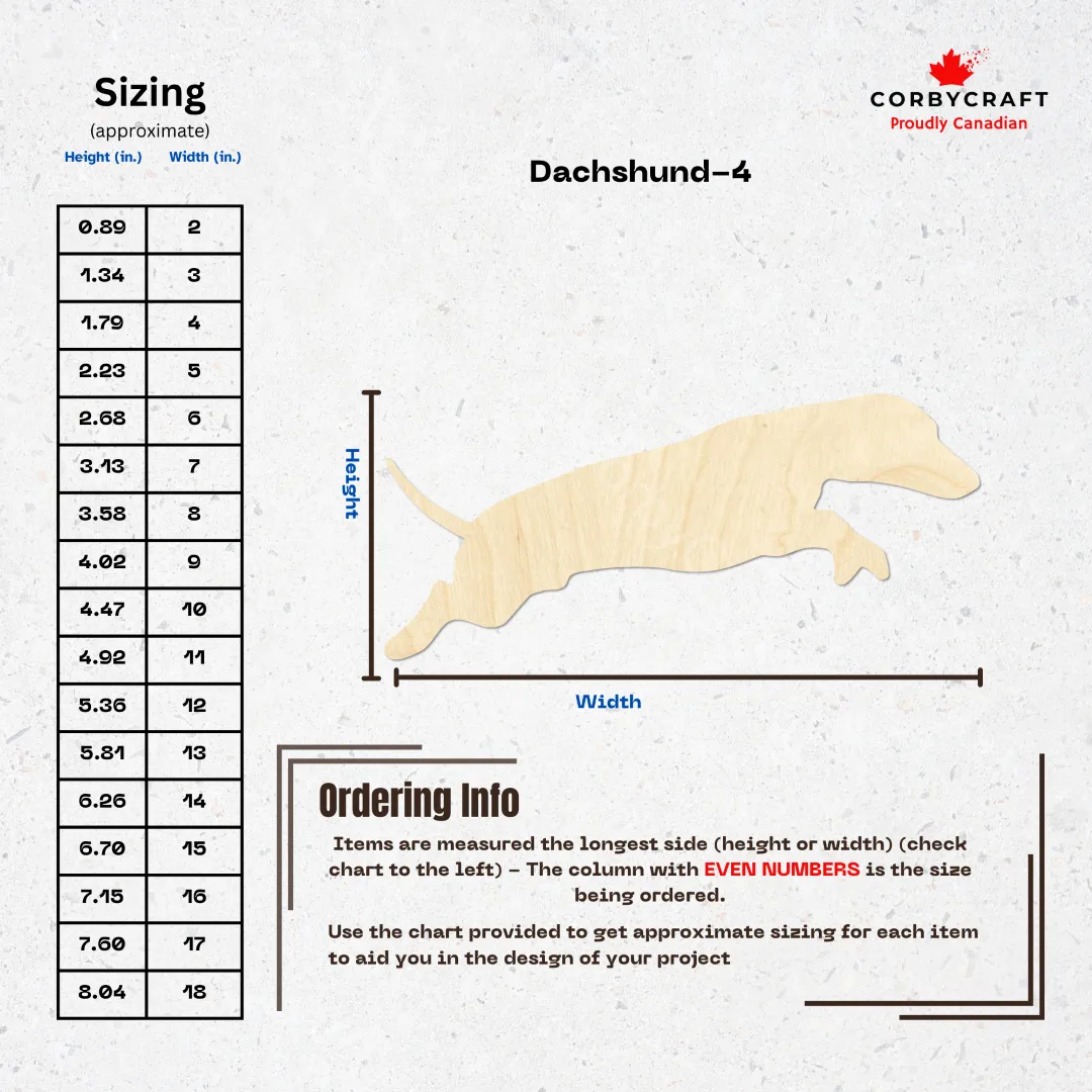 Whether you call them wiener dogs, sausage dogs, or doxies, dachshunds have a special way of stealing hearts. These laser-cut wooden shapes capture that iconic long body and short legs perfectly. Made from quality Baltic birch plywood, they’re ready for whatever creative direction you want to take them. Paint them, stain them, burn designs into them, or leave them naturalโthe choice is yours.