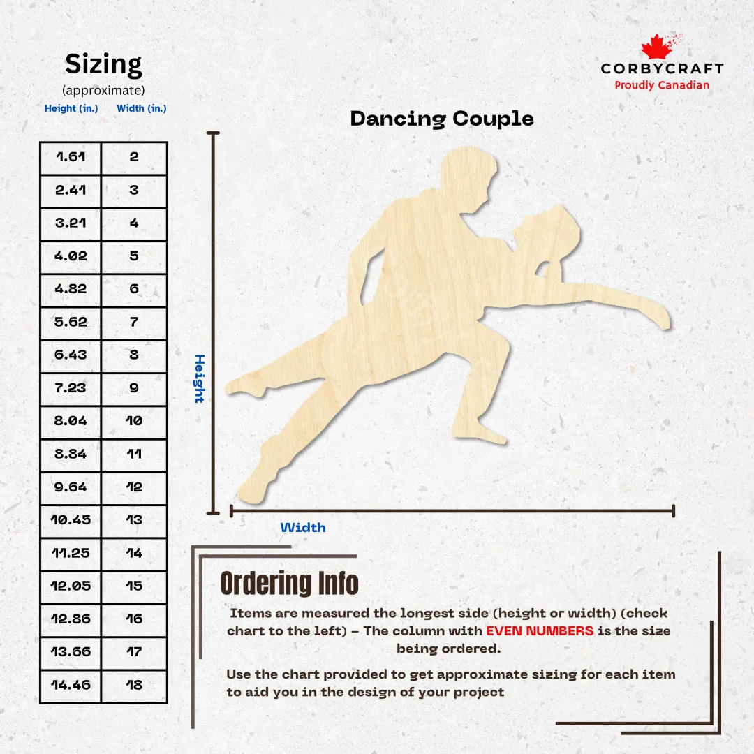 Meet the Dancing Couple blank โ a charming laser-cut wooden shape perfect for adding romance to your DIY projects. Cut from premium Baltic birch plywood with precision laser edges, this dancing couple design works beautifully as wall art, door hangers, wedding decorations, or personalized gifts. The unfinished wood is ready for your creative touch, whether you want to paint it, stain it, wood burn it, or leave it natural.